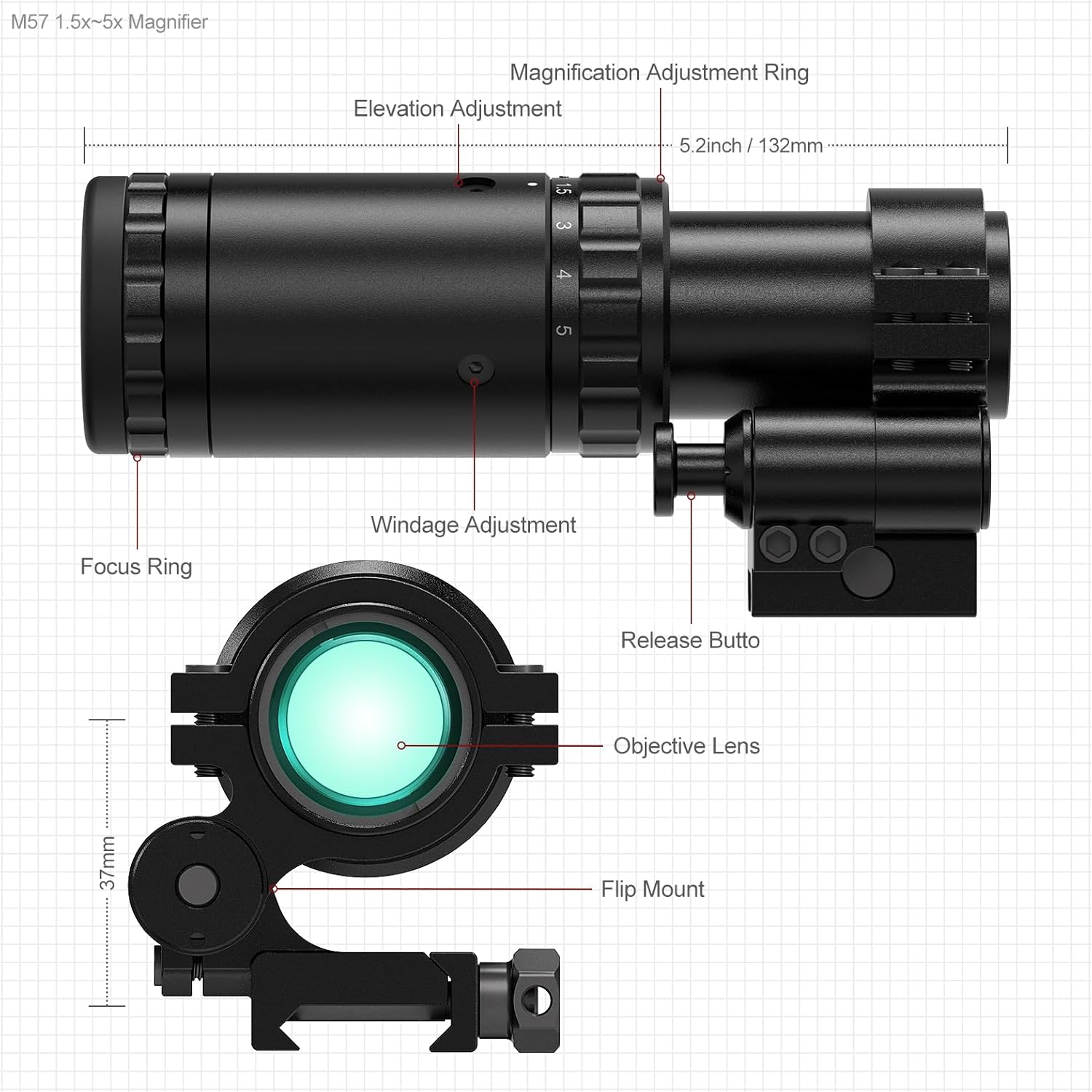 - Flexible 1.5x–5x magnification covers close to medium range.
