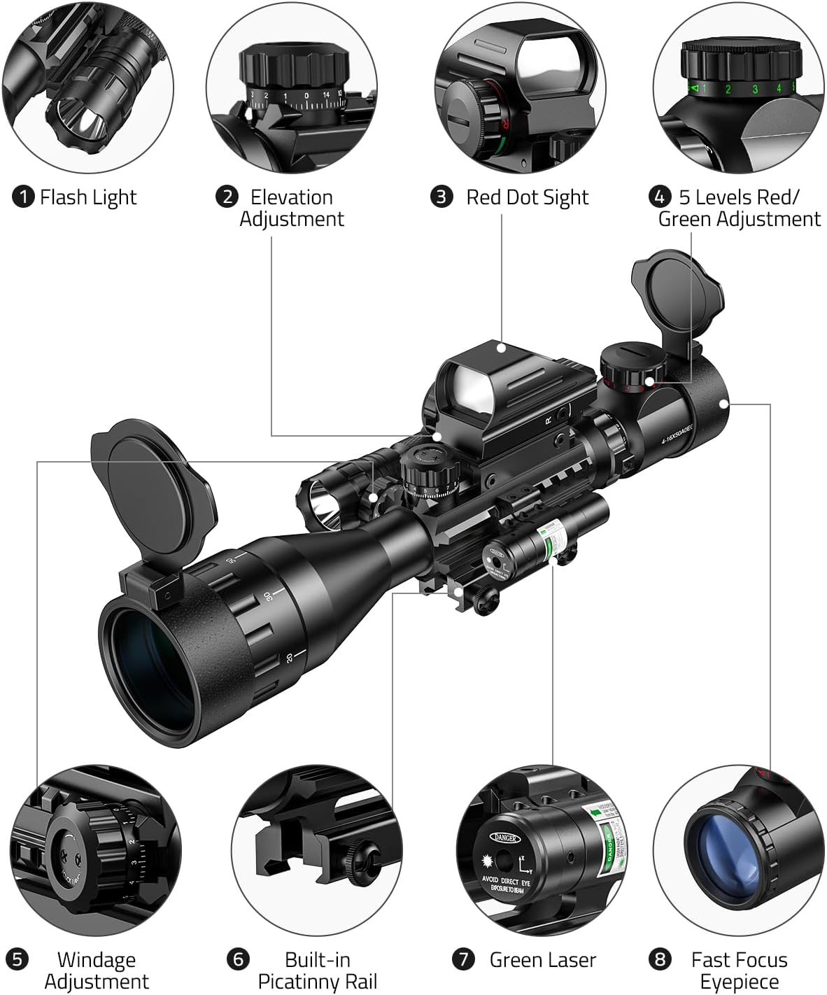 You get the 4-16×50 AO riflescope body, the illuminated holographic red/green reflex sight, a green laser module, a compact flashlight, mounting hardware, and basic manuals. The combo typically arrives pre-assembled on its built-in 22mm Picatinny-compatible rail, so you won’t spend hours trying to get everything aligned. You’ll still want to verify zero and make final adjustments once it’s on your rifle.