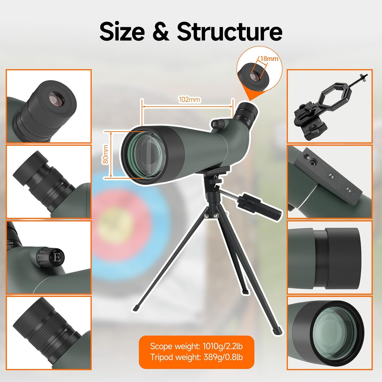The phone adapter is one of those modern conveniences that makes sprinting to capture a target or bird easier. It clamps your phone in place for digiscoping; expect modest results that are great for documentation and sharing, but not a replacement for a dedicated camera setup.